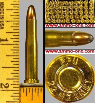 One Box of 50 Cartridges: .22 Hornet, newly made with “new brass”, cases with “PPU 22 Hornet” head-stamp and loaded with a 45 grain JSP (jacketed soft point) projectile.