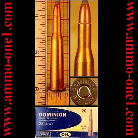 One Cartridge: .22 Savage High Power; by the Dominion Company of Canada. Factory made with “DOMINION 22 SAV” head-stamp loaded with a 70 grain JSP (Jacketed Soft Point) projectile and copper primer. Please Note: as the .22 Savage High Power is known in Europe as the 5.56x52Rmm.