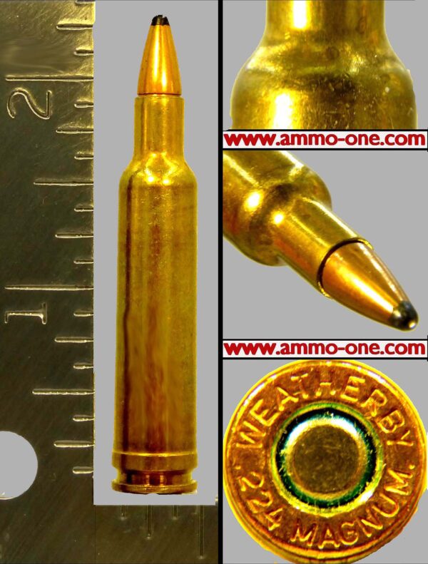 The .224 Weatherby is a high speed .22 caliber cartridge, at the time and today, featuring the distinctive double radius shoulder and belted case.