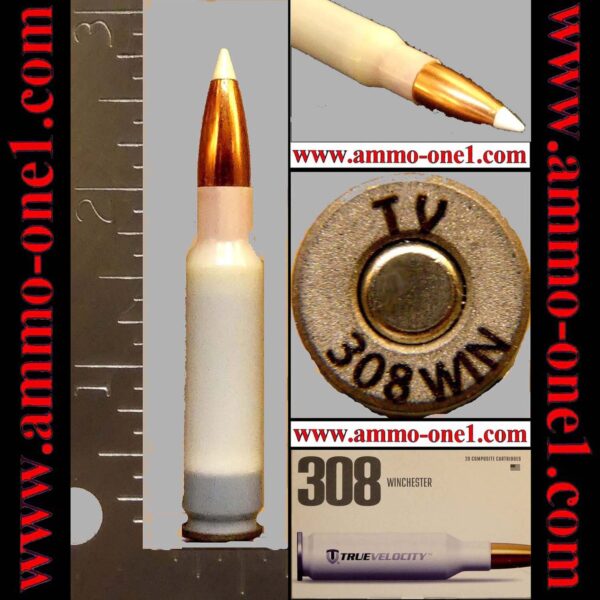 One Cartridge, not a box: .308 Winchester, factory loaded by True Velocity Ammunition LLC of Garland Texas, U.S.A. using Composite cases with a steel bottom insert, Head-Stamped “TV 308 WIN” and loaded with a 165 Grain, Nosler, Accubond projectile.