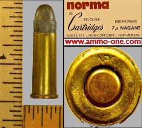 One Cartridge (not a box): 7.5 Swiss Army Revolver cartridge by Norma of Sweden, manufactured with new Norma brass with “NP” Head-Stamp, Berdan Primed, with a 103 Grain Greased Lead Projectile.