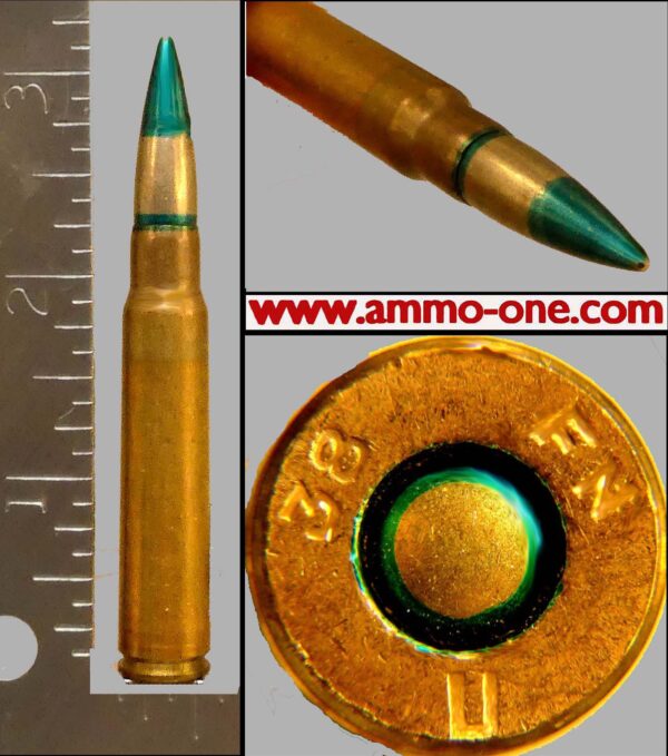 ONE CARTRIDGE, NOT A BOX!: 8mm Mauser JS, AP, produced in 1938 by FN (Fabrique Naionale of Herstal, Belgium for export to Yugoslavia. Using then new brass cases with “38 FN U” Headstamp and loaded with a Armor Piecing projectile with turquoise colored: bullet tip, case mouth to bullet sealer and primer sealer.